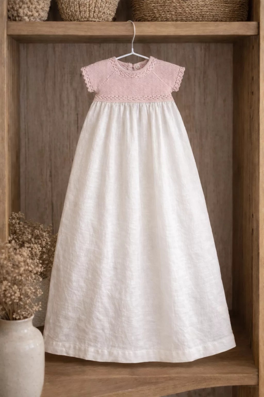 Faldón bebé hecho a mano, con cuerpo de punto algodón o lana y falda en bámbula o lino.