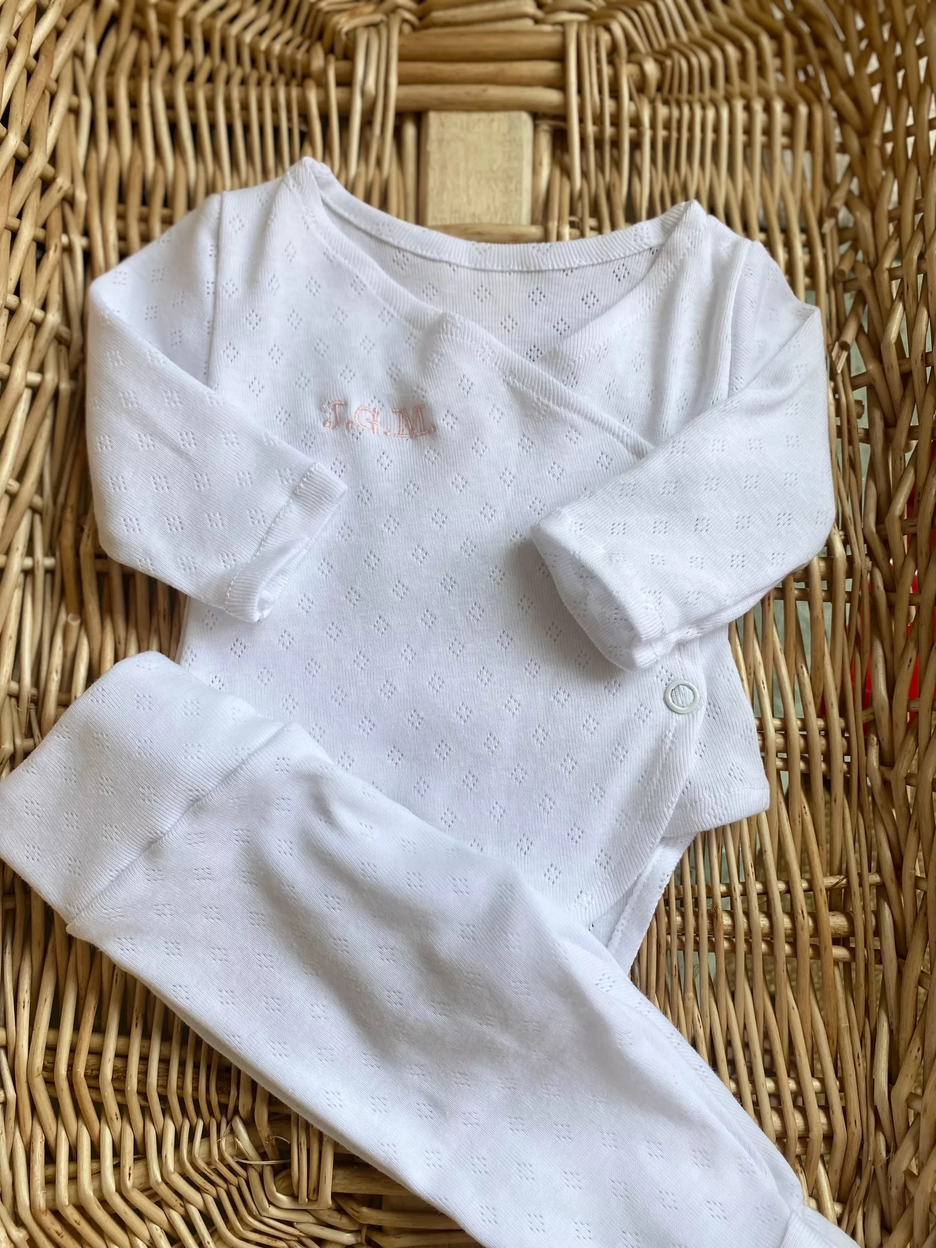 Conjunto de primera puesta formado por body y polaina en algodón calado, disponible la opción de bordar el body con nombre.Tiempo de proceso al bordar 8/10 días laborables.